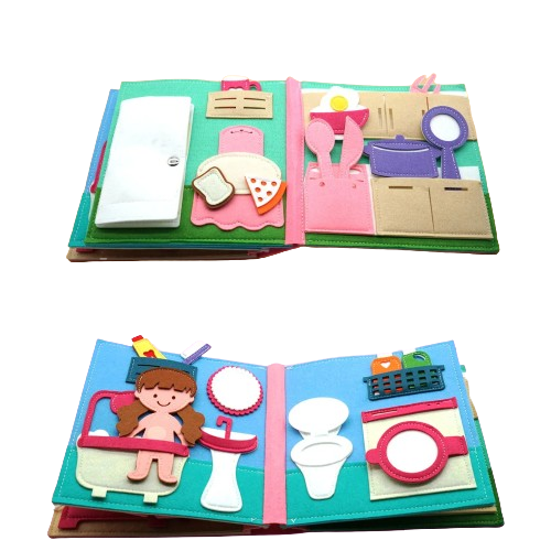 Dziecko ćwiczy podstawowe czynności związane z ubieraniem się, ucząc się samodzielności i koordynacji wzrokowo-ruchowej. Wykonana z bezpiecznych i miękkich materiałów, książeczka jest trwała i przyjemna w dotyku.
